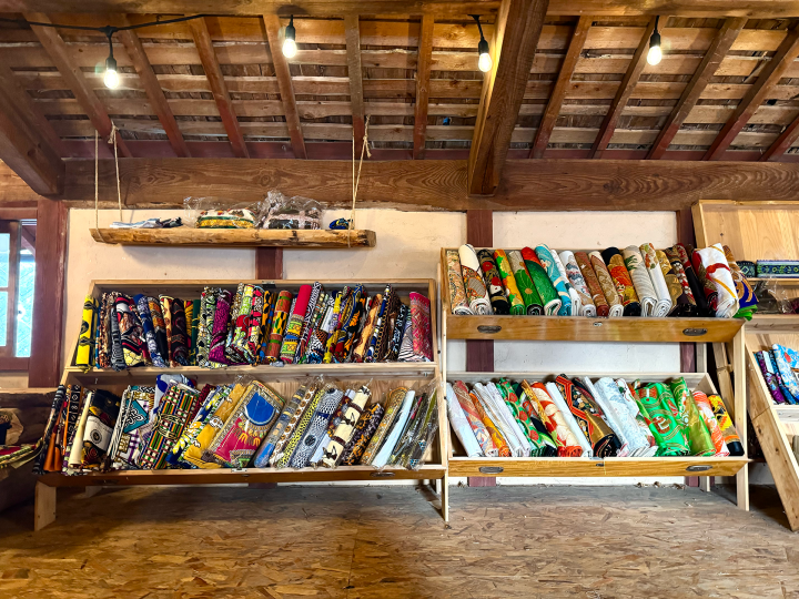 - 築100年以上の古民家民宿に併設されたカフェ。キッチンカーで淹れたコーヒーを受け取り、庭のベンチや縁側で宇和盆地を望みながらゆったり過ごせます。アトリエではアフリカ布を使ったバッグやパンツなどの手作り雑貨も販売や、バッグ作りなどの体験もあります。色鮮やかな布や写真を眺めながら、のんびりとした時間を楽しめます。